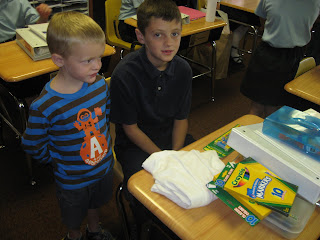 Today was Tage and Simon's first day of school. Tage, as always, was up early and dressed before breakfast...Simon on the other hand was slow to rise, dress and eat and by the looks of the following pictures he was less than excited...UNTIL he got there.